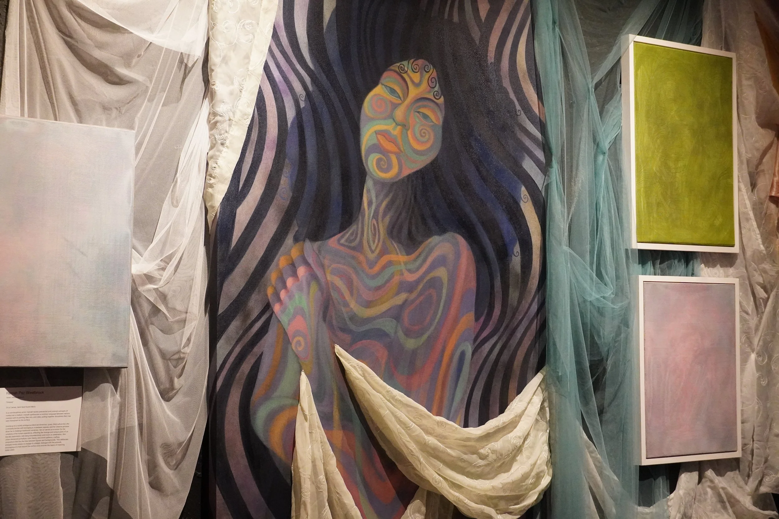 I ended up reworking an older piece I had in my collection. I felt like the colors and imagery paired perfectly with the feeling they were trying to evoke—ethereal, whimsical, and a little psychedelic. The process was a bit of a challenge as I tried to figure out how I wanted to incorporate fiber arts into the piece, but I ended up loving the way the sewn on fabric I attached to the painting melted into the rest of the installation around it. I was able to create its own environment for it to live in. It felt like a beautiful union between previous installation work I had done with tulle and the painting.